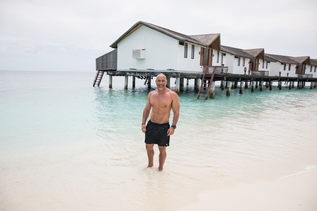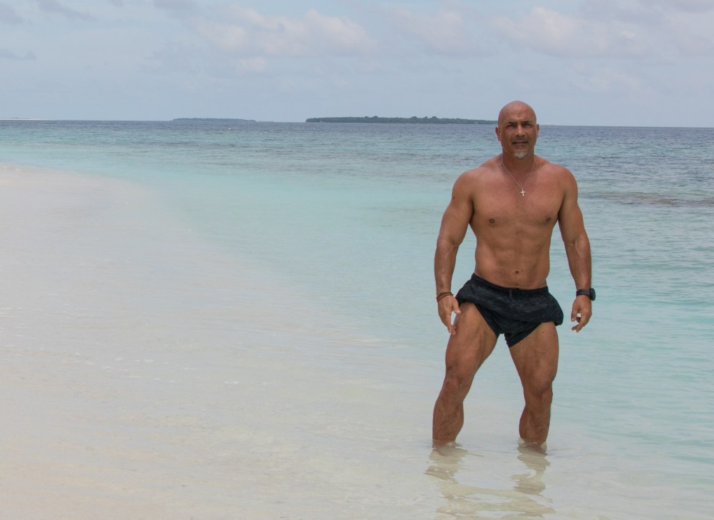 There were a few times in Maldives that I actually went to gym. Up to this point it was nearly 4 weeks of NO working out. But everyday a LOT of walking. Also took a little footage while working out in the local small gym on the island. Bodyfat slightly higher after the 4 vacation weeks but walking helped here and off course shape a little less pronounced. It was awesome to work out on such an secluded tropical island and afterwards walking to your bungalow by the beach without a shirt! Off course wife took some muscle photos…the background was just so crazy beautiful, we had too!